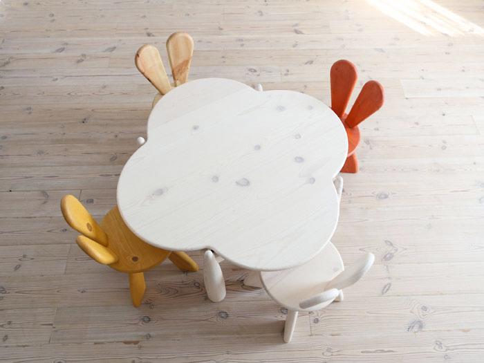 こども用家具として最初に手に取ることの多い「こども椅子」。ウサギのお耳のような背もたれの『キッズラビットチェア』は、カラフルな色の中にパイン材の節目や木目が見えナチュラルな雰囲気。大人も一緒に座ってお絵かきをしたり工作をするのにちょうど良いサイズです。