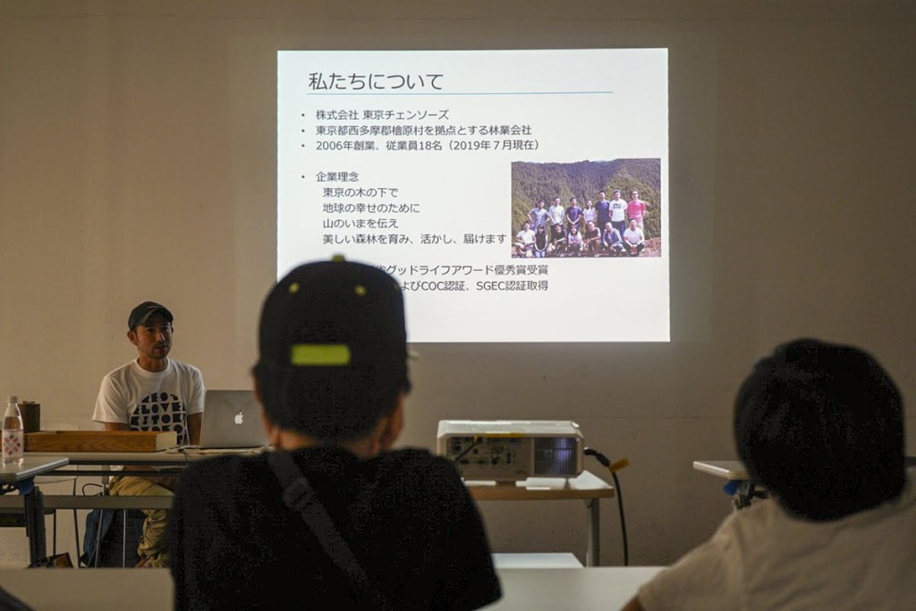 スクリーンに映し出される画像や表のデータを通して、現在の東京の森の問題点を東京チェンソーズ青木さんが分かりやすい言葉で説明してくれました。