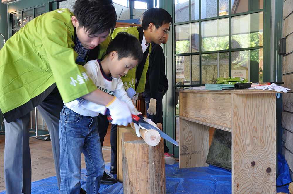 丸太をノコギリで切ってコースターを作ります。たくさんの子や大人の方も丸太切りに挑戦してくれて、八角堂の入り口付近はイベント中ずっとヒノキの木くずのいい匂いがしていました。