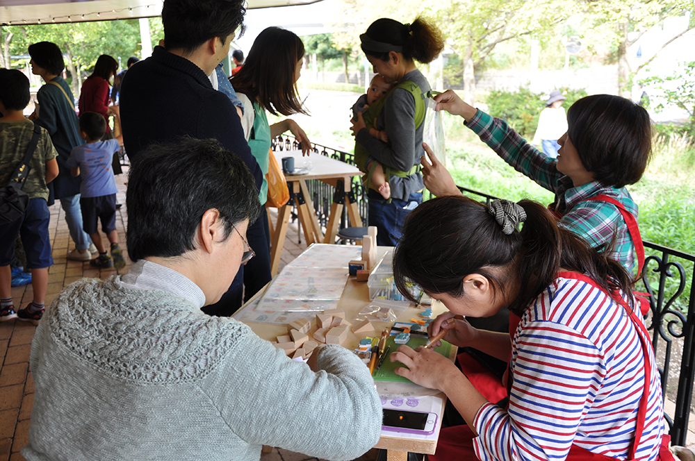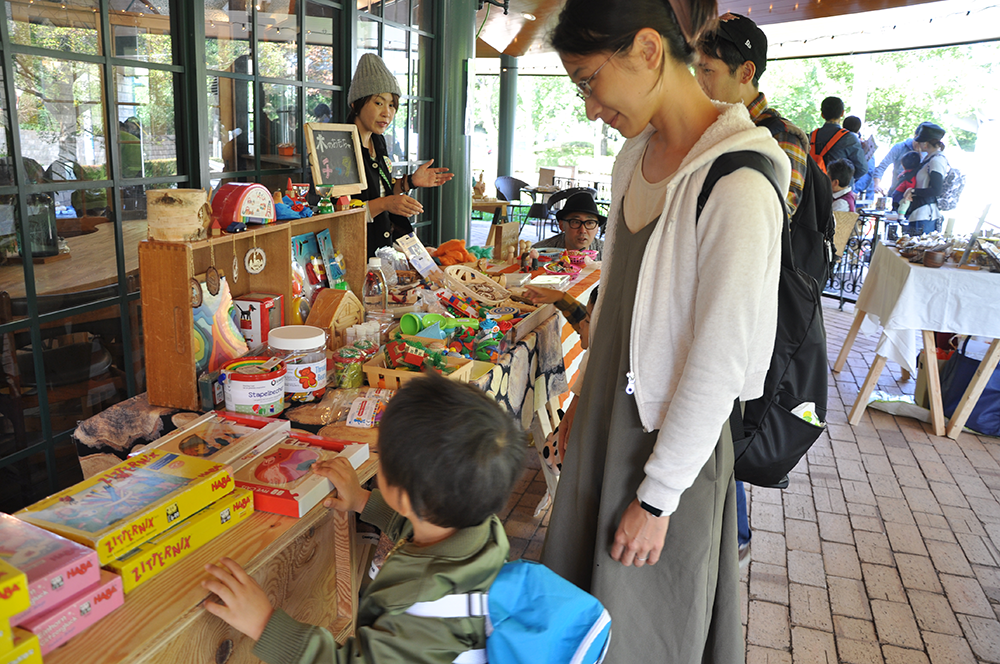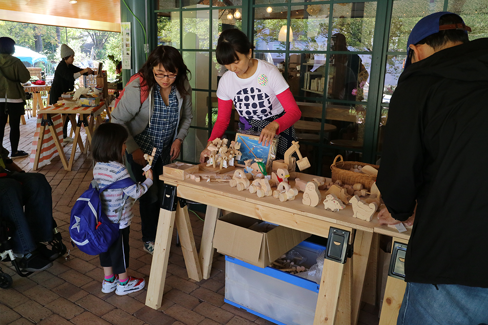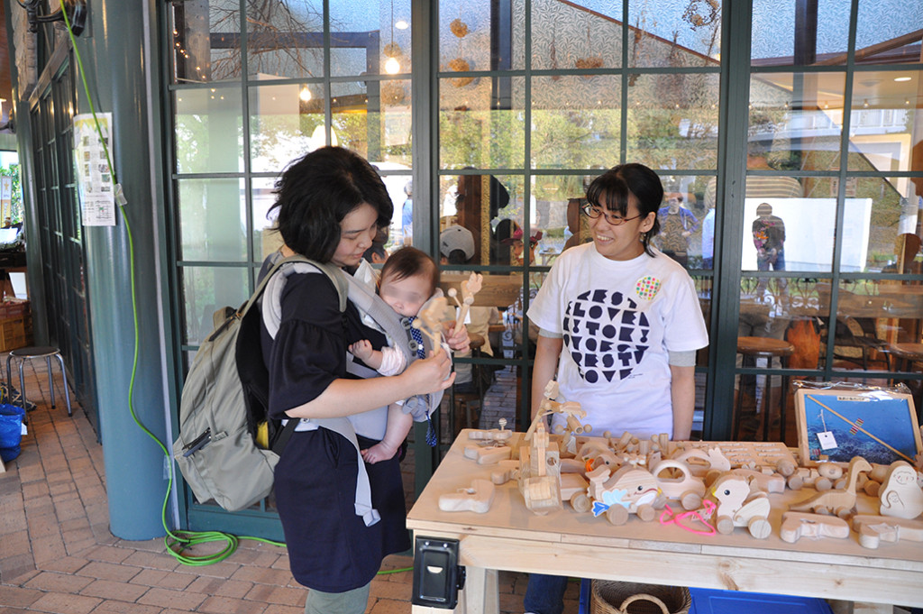 11:00の開始前から各お店を見てまわるご家族も。木のおもちゃに興味津々なお子様の表情を見て、楽しんでもらえるイベントになりそうだな、と嬉しい予感がしました。
