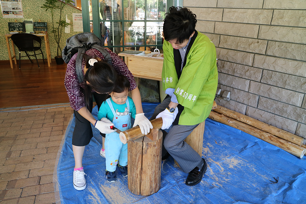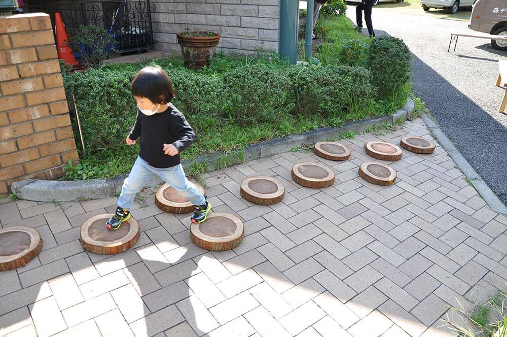 ケンケンパで遊ぶ丸太ぼっくりや、木の魅力を活かした雑貨などが展開します。