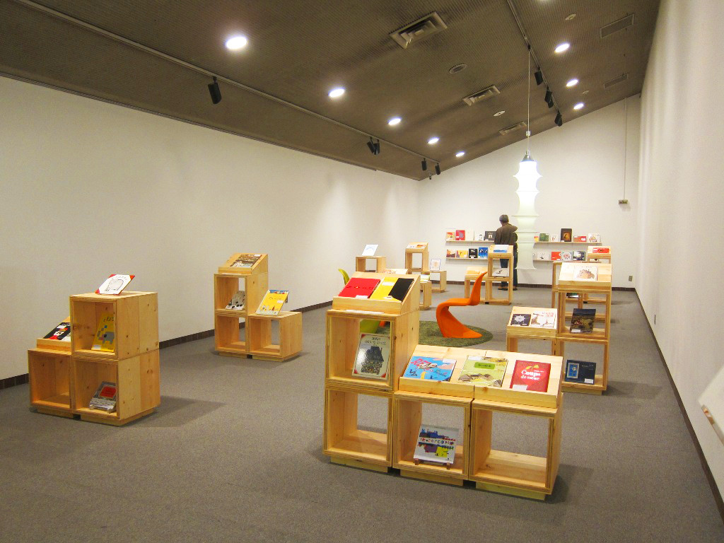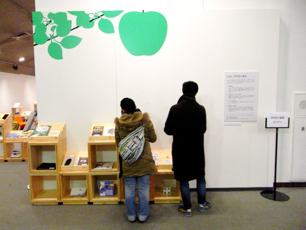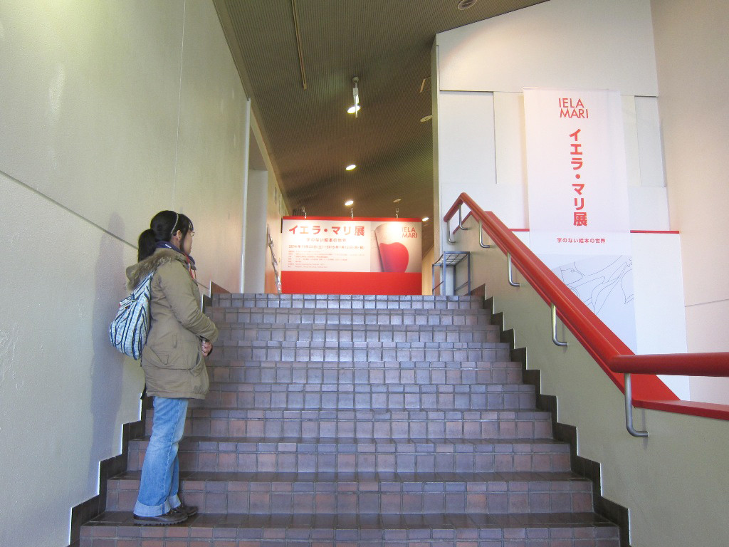 階段を上り受付を済ませるとすぐに、イエラ・マリ展ロビー・字のない絵本の特集コーナーがあります。