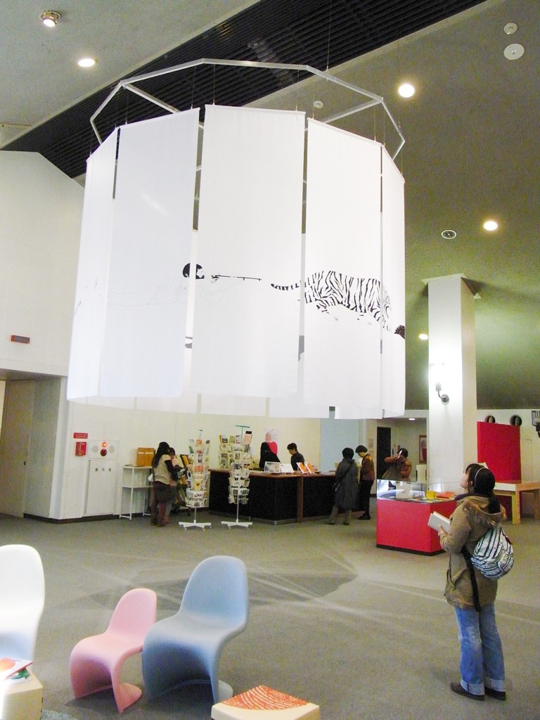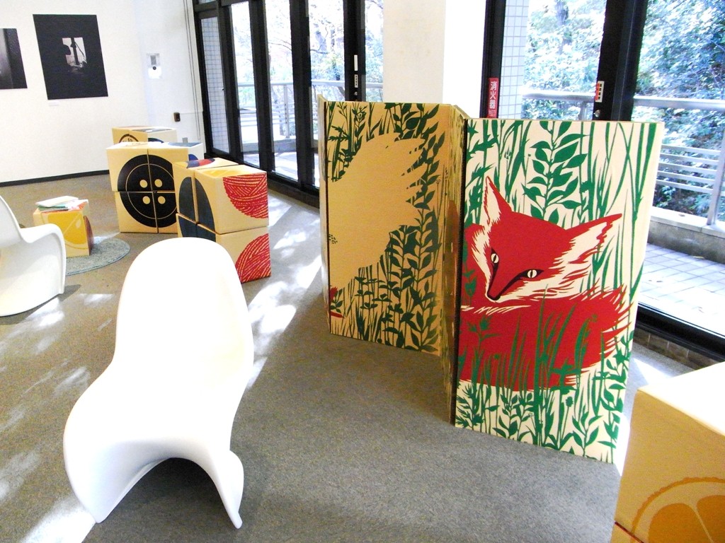 ロビーには他にも、イエラの絵本から抜け出してきた絵が、屏風や大きな絵合わせブロックパズルになって置いてあります。ブロックパズルは動かして遊ぶことが出来るので、毎日違った絵柄になっているそうです。私たちが訪れたときも、お子さんが遊んでいました。