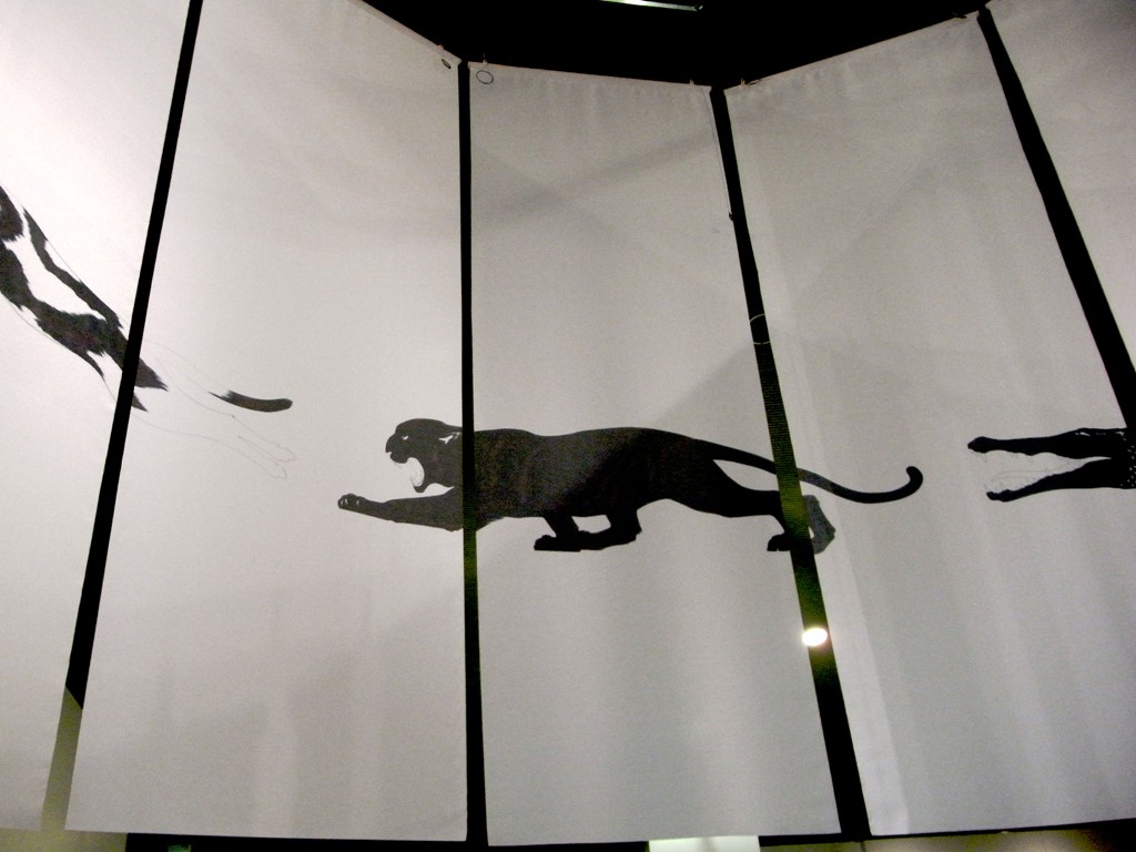 向かって右側には『たべちゃうぞ』の原画が並べられていて、目の前にいる動物に、いまにも襲いかかりそうな動物たちが生き生きと描かれていました。一頭の動物がページからはみ出して構成されているので、こちら側に飛び出してきそうに見えます。クロヒョウなど、黒く塗りつぶしてある動物の細かいペン遣いなどが原画ならではの迫力があり、いつまでも観賞していられそうでした。