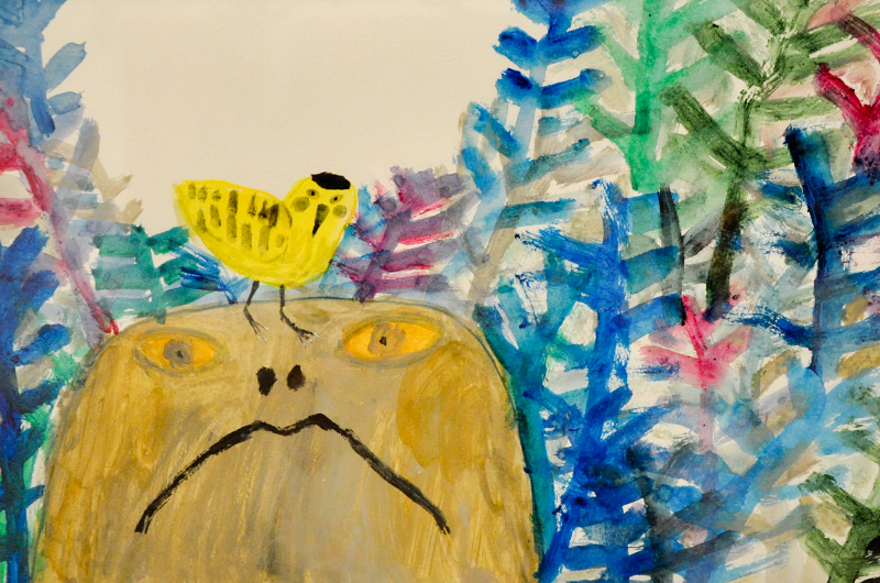 原画は、「ヒワとゾウガメ」「ぼくのふとんはうみでできている」の2作品が展示されていました。迫力満点で、出版された絵本よりも強い眼力(めぢから)をもつ動物たちは、見ごたえ抜群です。
