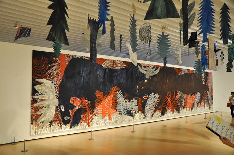 まず目に入ってくるのが、今回の展覧会会場で描かれた作品「ヘラジカの森」です。高さ2.6m×横幅12.5mもある大きな作品です。