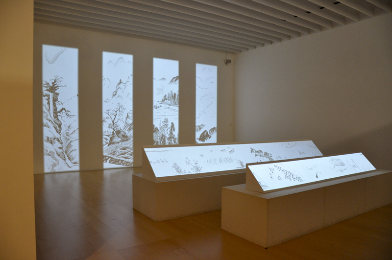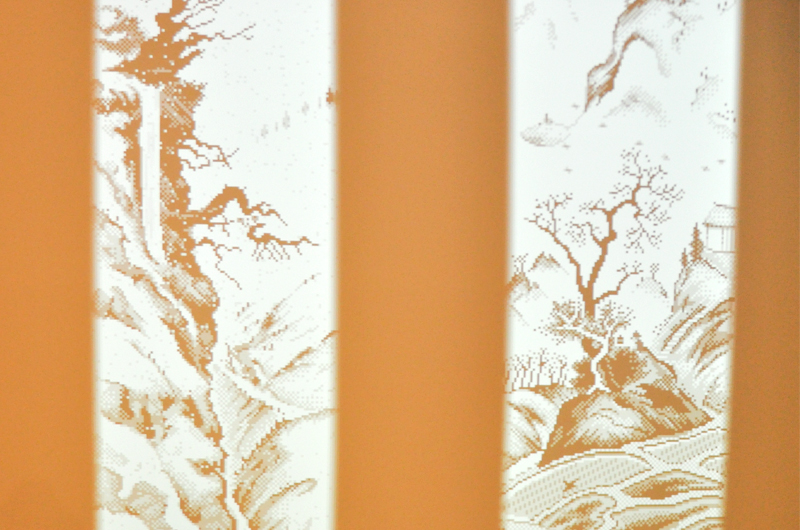 横須賀美術館という場所でみることに意味がある作品を作ろうということで、所蔵作品をモチーフに作られたのがこの「画素山水」です。作品の元になった小川芋銭の「春夏秋冬」を始めに見てから、光り輝く展示室へといざなわれます。