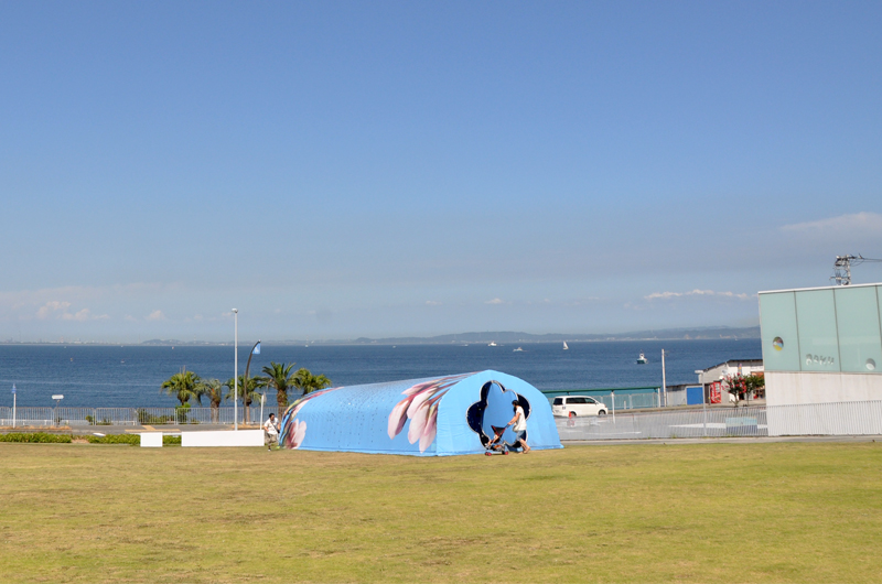 美術館をめざして海岸沿いを歩いていると、まず芝生の上の鮮やかなブルーのビニールハウスが目に入りました。海に気を取られていたところを一気にそちらに気持ちが引き寄せられ、ワクワクして、早く見たいと急ぎ足に。