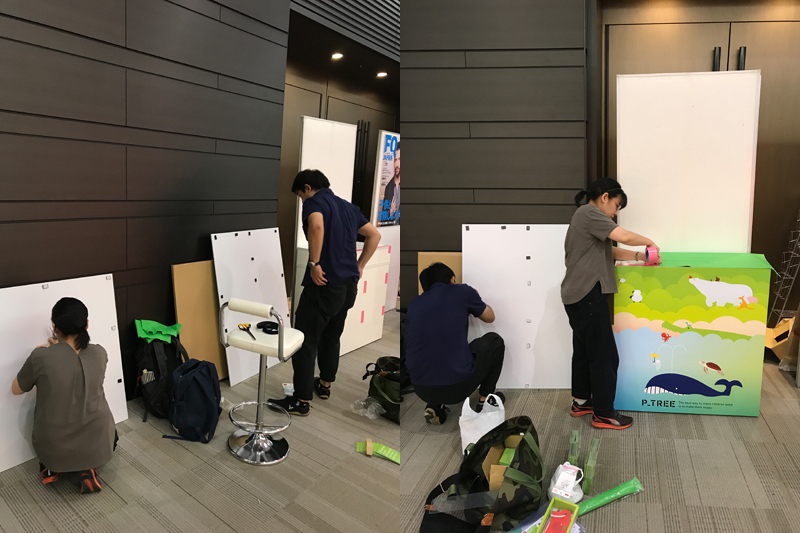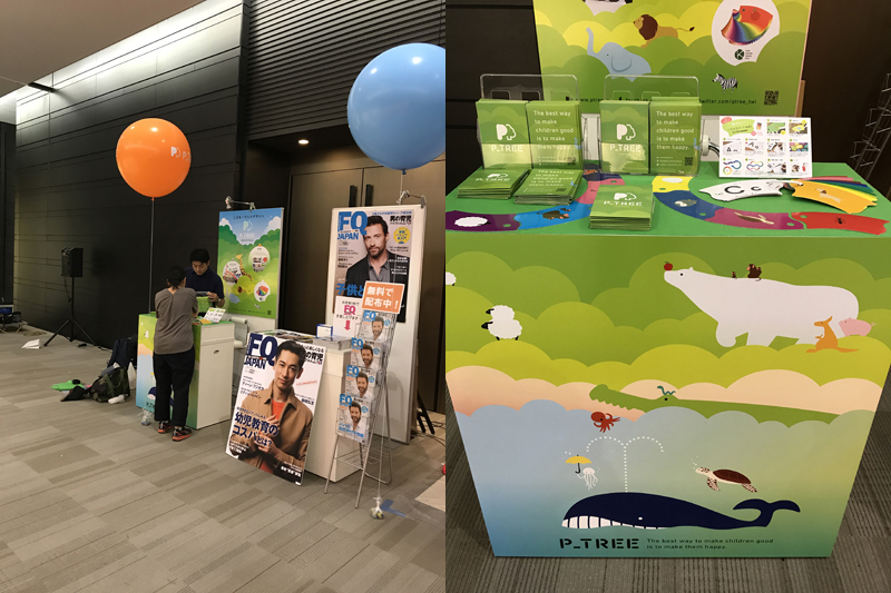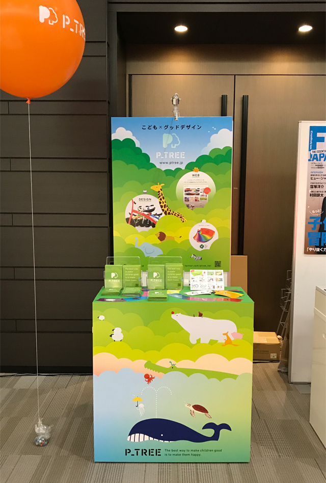 前回に引き続き、入り口近くにP_TREEのカウンターも出させていただきました。kakukaku labのお二人に手伝ってもらって、こんな感じでかわいくデコレーションしてみました。