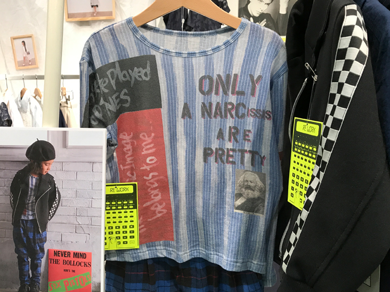 背景のレコードジャケットを見てお分かりの通り、ロックをテーマにしたこども服が色々と展示されていました。なかでもアナーキーシャツやボンデージパンツなんて、お父さん世代には堪らない方も多いんじゃないでしょうか。