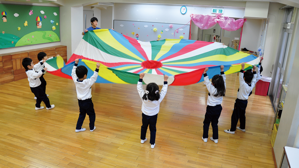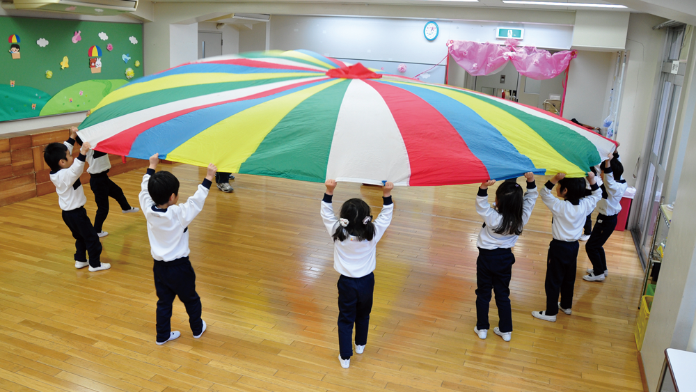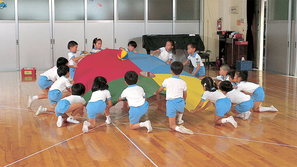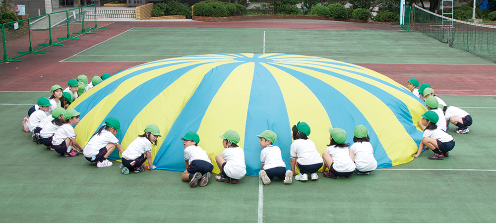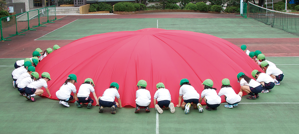プレイバルーンは演技の中で、飛行船のように大きく膨らんだり、きれいな万華鏡になったりします。こどもたちひとりひとりが仲間と息を合わせて動くことで、丸い布にダイナミックな動きをさせるのです。 運動会では観客席から大歓声が上がっていましたが、誰よりも演技をしている本人たちがプレイバルーンを持つ手を通じて、みんなでつくりあげた夢のような動きを感じることができるのでしょう。