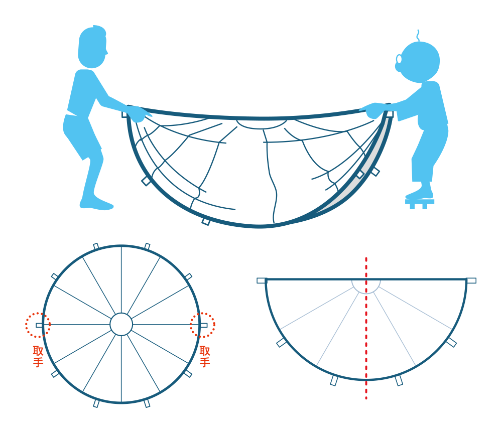 サイズは10人から遊べる3mから、30人で演技をする7mまで4段階で展開しているのでちょっとした遊びから、大きな行事まで幅広い場面で活躍してくれそうです。