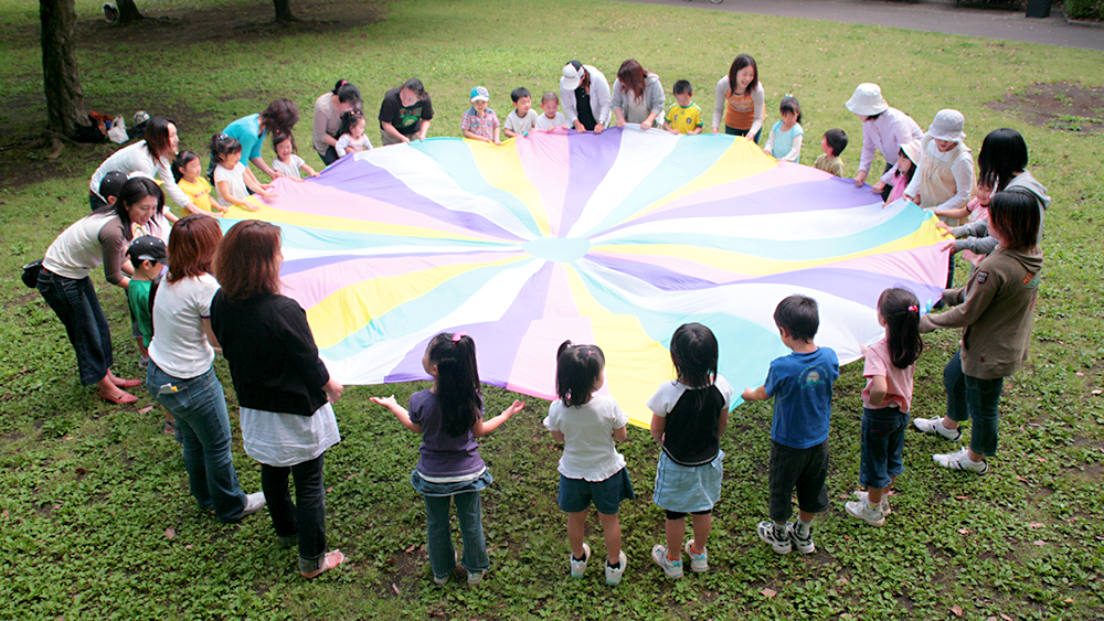 握り方や座り方などは遊ぶ前に一度全員で確認するといいですね! 上げ下ろしで山をつくるときは「1,2,3でバンザイするよー」、②でしゃがむときは「地面にフタをしてみよう!」などこどもたちとばっちり息を合わせる掛け声も大事なのだとか。 お次は私が挑戦してほしい応用種目をご紹介します。