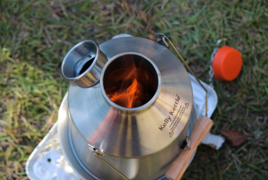ケリーケトルが普通のやかんと異なる点は、本体が外壁と内壁にわかれた二重構造になっていること。外壁と内壁の間に水を入れ、ファイヤーベースと言われる底の部分に燃料を入れて点火し本体を上に載せると、本体の空洞部分が煙突の役割をします。下からだけでなく、空洞部分からも熱が伝わるので素早く湯が沸かせます。