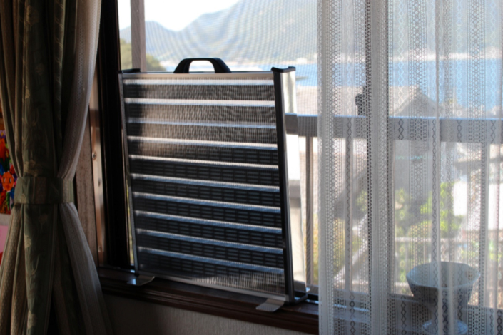 この非電化除湿機は、湿気を吸収すると色が変わるブルーのシートを応用している商品です。湿気を吸ってシートの色がピンクに変わったら、太陽光に当てて乾燥させます。